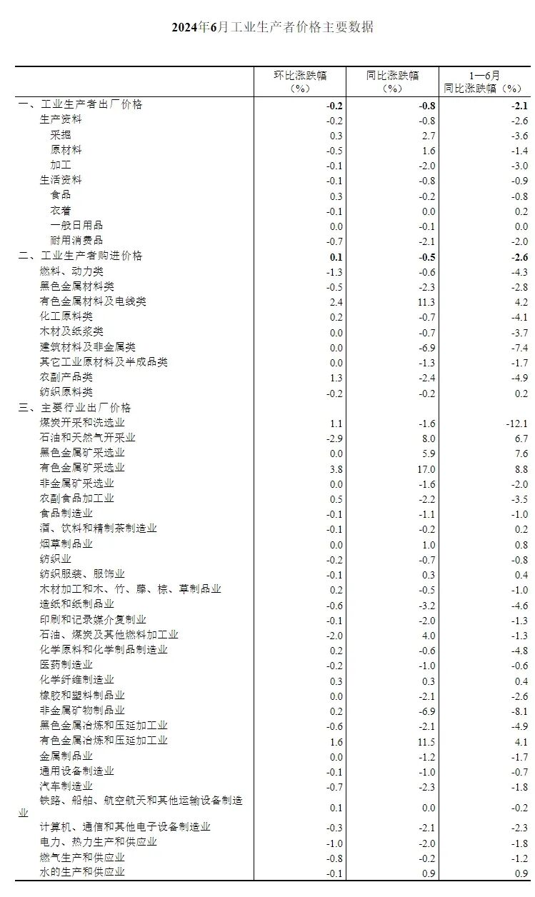【数据发布】2024年6月份工业生产者出厂价格同比降幅继续收窄