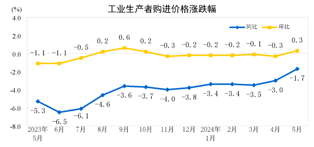 2024年5月份,全国工业生产者出厂价格同比下降1.4%,降幅比上月收窄1.1个百分点,环比上涨0.2%,上月为下降0.2%;工业生产者购进价格同比下降1.7%,环比上涨0.3%。1—5月平均,工业生产者出厂价格比上年同期下降2.4%,工业生产者购进价格下降3.0%。