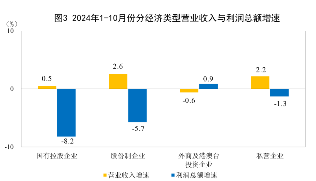 1—10月份,全国规模以上工业企业实现利润总额58680.4亿元,同比下降4.3%(按可比口径计算,详见附注二)。1—10月份,规模以上工业企业中,国有控股企业实现利润总额18530.9亿元,同比下降8.2%;股份制企业实现利润总额43718.5亿元,下降5.7%;外商及港澳台投资企业实现利润总额14559.0亿元,增长0.9%;私营企业实现利润总额16501.7亿元,下降1.3%。1—10月份,采矿业实现利润总额9845.3亿元,同比下降12.7%;制造业实现利润总额42223.1亿元,下降4.2%;电力、热力、燃气及水生产和供应业实现利润总额6612.0亿元,增长11.5%。1—10月份,主要行业利润情况如下:有色金属冶炼和压延加工业利润同比增长40.0%,电力、热力生产和供应业增长13.8%,计算机、通信和其他电子设备制造业增长8.4%,纺织业增长5.3%,农副食品加工业增长2.8%,通用设备制造业下降0.1%,石油和天然气开采业下降1.8%,汽车制造业下降3.2%,电气机械和器材制造业下降5.1%,专用设备制造业下降5.2%,化学原料和化学制品制造业下降7.7%,煤炭开采和洗选业下降23.7%,非金属矿物制品业下降49.6%,石油煤炭及其他燃料加工业、黑色金属冶炼和压延加工业同比由盈转亏。1—10月份,规模以上工业企业实现营业收入110.96万亿元,同比增长1.9%;发生营业成本94.75万亿元,增长2.3%;营业收入利润率为5.29%,同比下降0.34个百分点。10月末,规模以上工业企业资产总计176.74万亿元,同比增长4.6%;负债合计102.01万亿元,增长4.5%;所有者权益合计74.73万亿元,增长4.9%;资产负债率为57.7%,同比下降0.1个百分点。10月末,规模以上工业企业应收账款26.33万亿元,同比增长7.8%;产成品存货6.53万亿元,增长3.9%。1—10月份,规模以上工业企业每百元营业收入中的成本为85.39元,同比增加0.32元;每百元营业收入中的费用为8.42元,同比增加0.06元。10月末,规模以上工业企业每百元资产实现的营业收入为77.3元,同比减少2.7元;人均营业收入为182.4万元,同比增加6.6万元;产成品存货周转天数为20.0天,同比增加0.2天;应收账款平均回收期为66.7天,同比增加3.9天。10月份,规模以上工业企业利润同比下降10.0%。